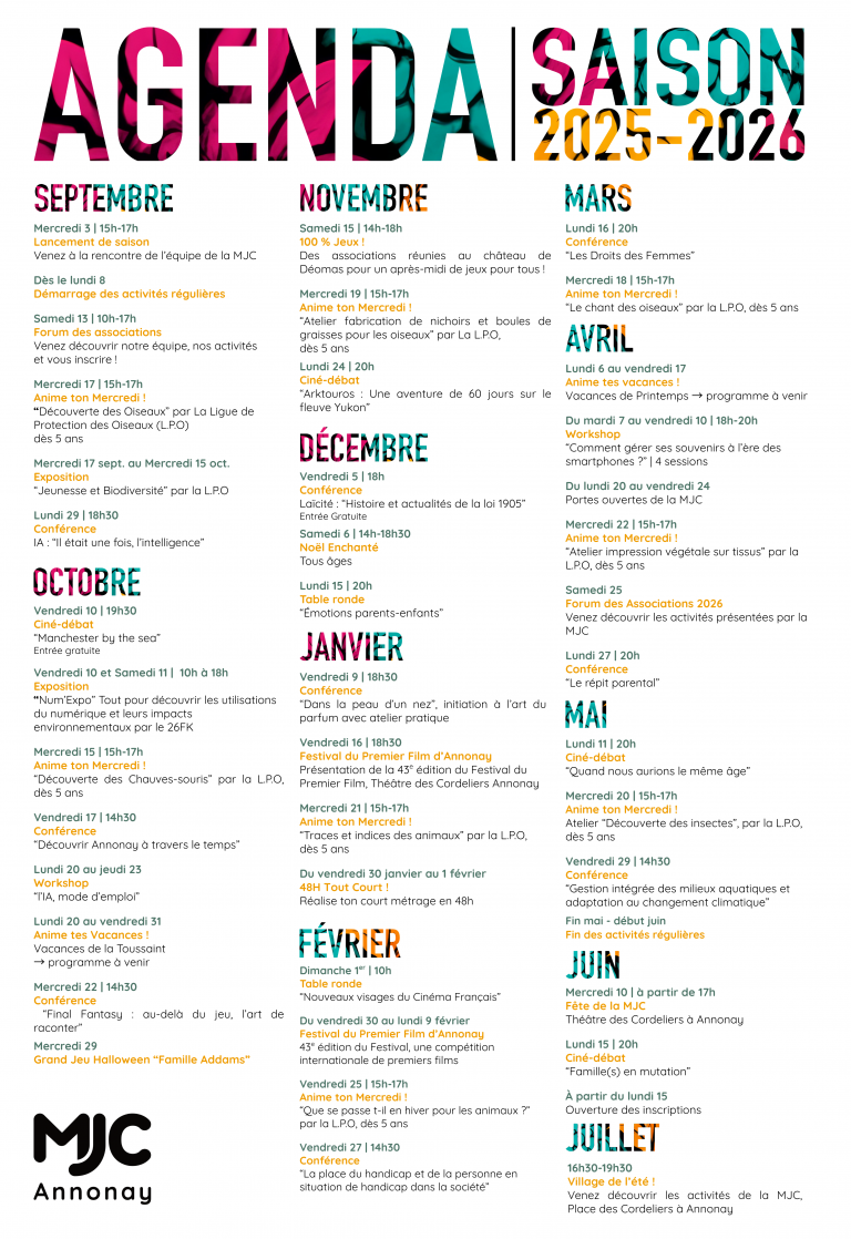 Deux mercredis après-midi par mois, la MJC proposera des animations ou ateliers thématiques (éducation à l’environnement, ateliers collaboratifs, cuisine, sciences, conférences parentalité, cinéma…) N’hésitez pas à suivre nos actualités sur le site internet de la MJC et sur les réseaux sociaux !